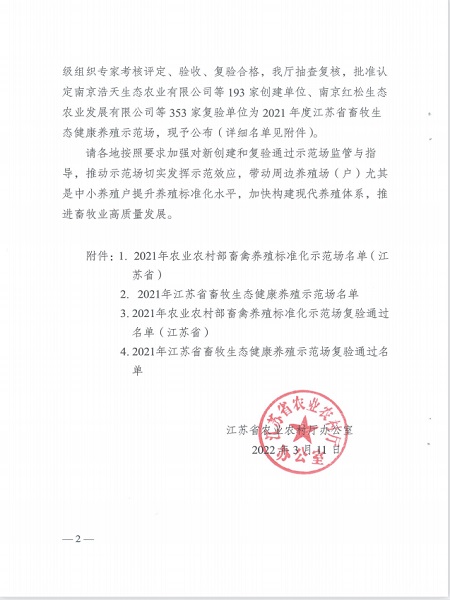 近日,高郵鴨集團(tuán)從江蘇省農(nóng)業(yè)農(nóng)村辦公室文件獲悉,江蘇高郵鴨發(fā)展集團(tuán)有限公司獲評(píng)“2021年江蘇省畜牧生態(tài)健康養(yǎng)殖示范場(chǎng)”。