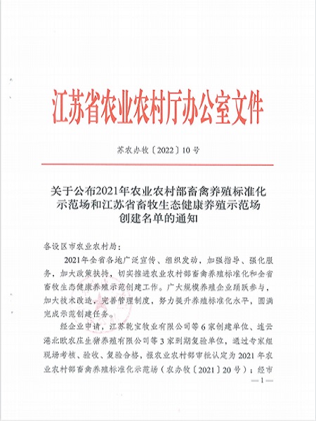 近日,高郵鴨集團(tuán)從江蘇省農(nóng)業(yè)農(nóng)村辦公室文件獲悉,江蘇高郵鴨發(fā)展集團(tuán)有限公司獲評(píng)“2021年江蘇省畜牧生態(tài)健康養(yǎng)殖示范場(chǎng)”。