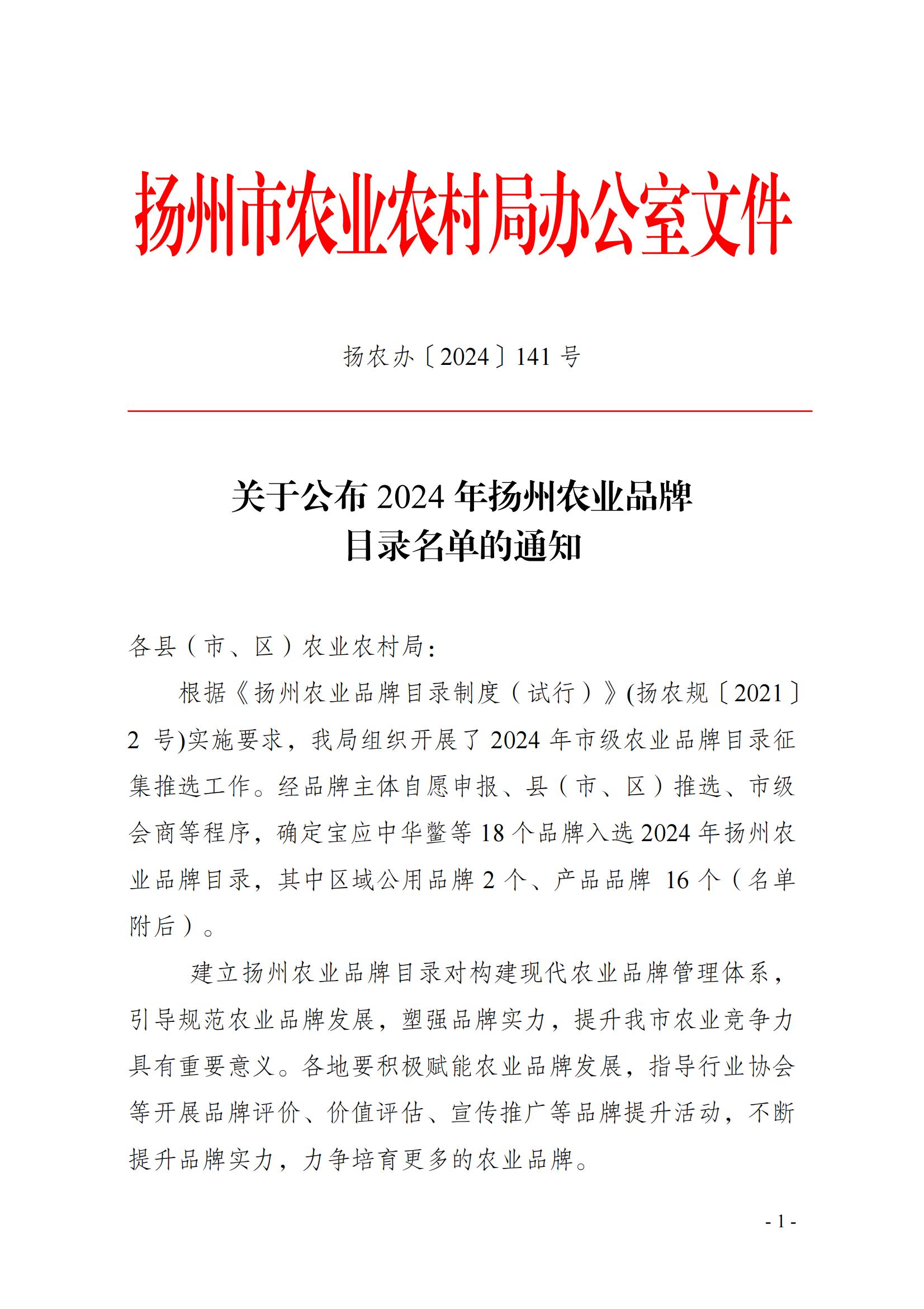近日,揚(yáng)州市農(nóng)業(yè)農(nóng)村局公布了2024年揚(yáng)州農(nóng)業(yè)品牌目錄名單,高郵鴨集團(tuán)“高郵湖”品牌鴨蛋成功入選目錄名單。